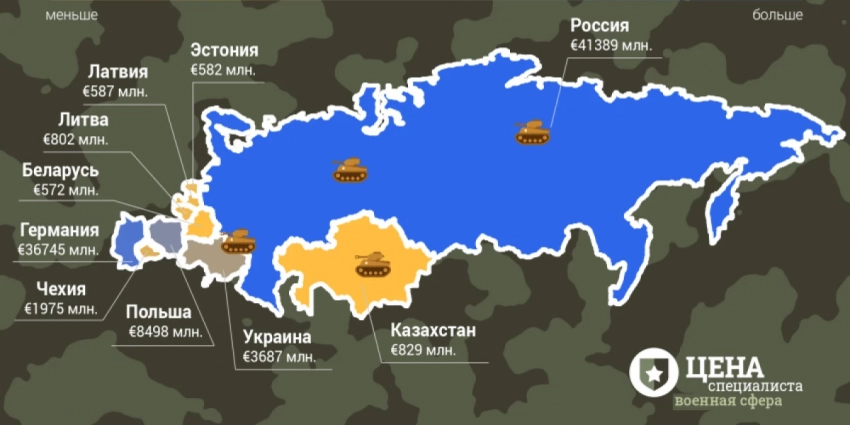 Мы решили рассмотреть расходы на оборону в 10 странах – Беларуси, соседних государствах, а также Казахстане, Чехии, Эстонии и Германии. У Беларуси среди них – самый маленький военный бюджет. По данным Минфина, в 2019 году он составлял 1 млрд 339 млн рублей или 572 млн 390 тысяч евро. Для сравнения: в этот же год расходы на оборону Литвы были около 802 млн евро, на оборону Латвии – около 587 млн евро, на оборону Эстонии – около 582 млн евро. То есть даже Эстония, где проживает 1,3 млн человек, имеет бюджетные расходы на национальную оборону больше, чем в Беларуси.