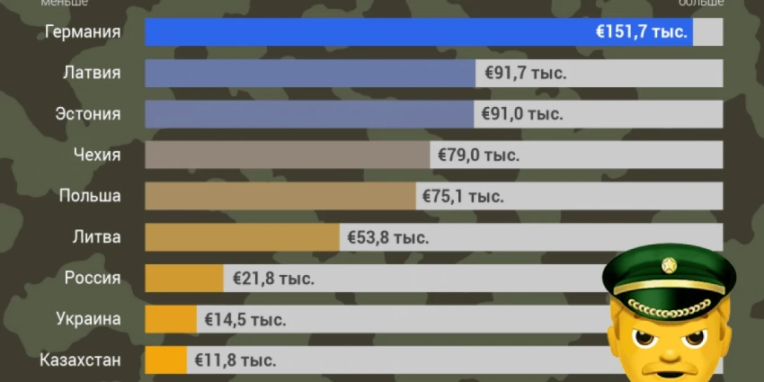 Для сравнения: в Казахстане этот показатель 987 евро, в Украине – 1 тысяча 236 евро, в России – 1 тысяча 812 евро, в Литве – 4 тысячи 484 евро, в Польше – 6 тысяч 260 евро, в Эстонии – 7 тысяч 581 евро, а в Германии – 12 тысяч 642 евро.