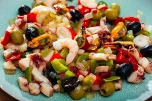 Салат с крабами, креветками и мидиями