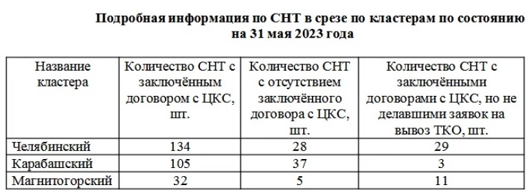 Не заключили договор на вывоз ТКО с ЦКС: в Агаповском районе СНТ «Лазурный», коллективное общество садоводов № 3 «Гуровский» и садоводческое товарищество «Неженка»; в Кизильском районе — некоммерческое садоводческое товарищество № 2 «Кизильское»; в ГО Локомотивный — СНТ «Локомотив».
