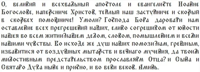 В этот день верующие прибегают к молитвам перед святым апостолом Иоанном Богословом. Они просят о здоровье, взаимопонимании в семье и душевном спокойствии. Семьи, мечтающие о потомстве, умоляют его о даровании счастья материнства. Рыбаки обращаются к нему за поддержкой и удачей в их нелегком труде на море, передает сайт Novorussiia.ru.