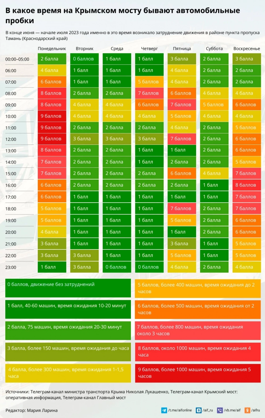 «Есть определенные дни и временные отрезки, которые выбирают для проезда по мосту большинство отдыхающих. Тогда в очереди на досмотр скапливается более 1000 машин и время ожидания может достигать 4-5 часов. Но в другие дни и часы подъезд к Крымскому мосту относительно свободен, и при планировании поездки лучше ориентироваться именно на эти промежутки» — сообщает аналитик издания AIF.ru.
