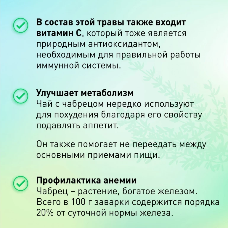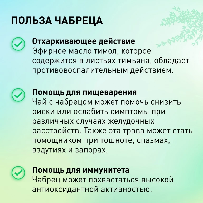 Чабрец может помочь улучшить пищеварение и снизить вздутие в желудке. Он может также помочь облегчить симптомы менструальных болей и снизить стресс и тревожность. Растение содержит антиоксиданты, которые помогают бороться со свободными радикалами в организме. И это далеко не все его полезные свойства.