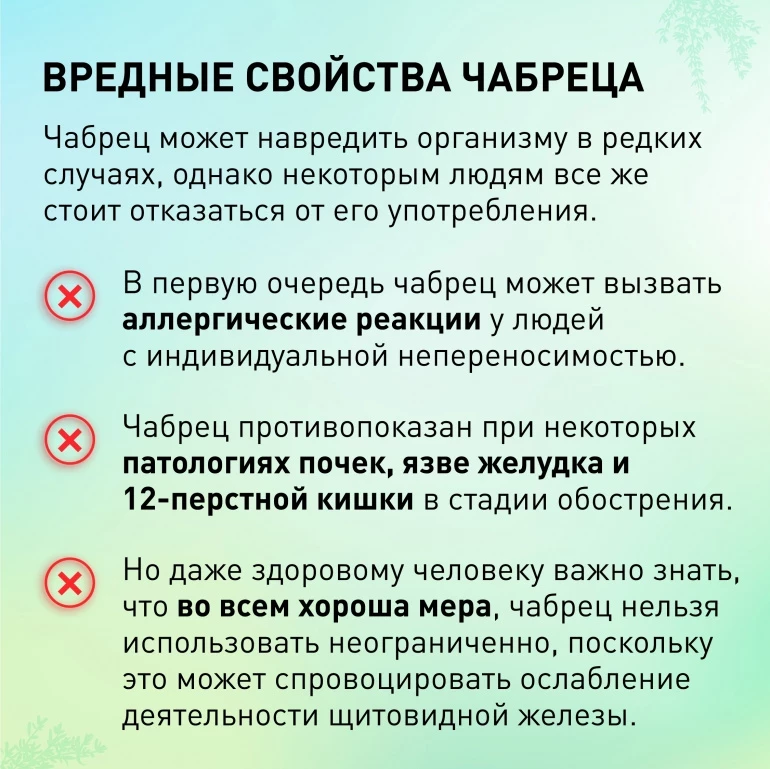 Однако чабрец может вызвать аллергическую реакцию у некоторых людей, поэтому, если у вас есть аллергия на другие растения, стоит обратиться к врачу, прежде чем употреблять его в пищу или использовать для лечения. Есть и другие нюансы.