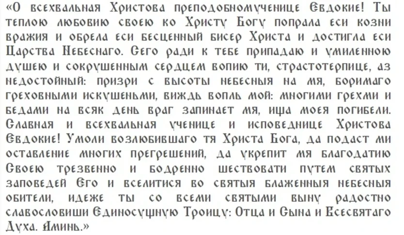 Считается, что молитвы святой Евдокии помогают обрести душевное спокойствие и укрепиться в вере. Ее память чествуют вдовы, сироты, старики и одинокие люди, которые обращаются к ней с просьбами о помощи в трудные моменты жизни, пишет сайт Novorussiia.ru.