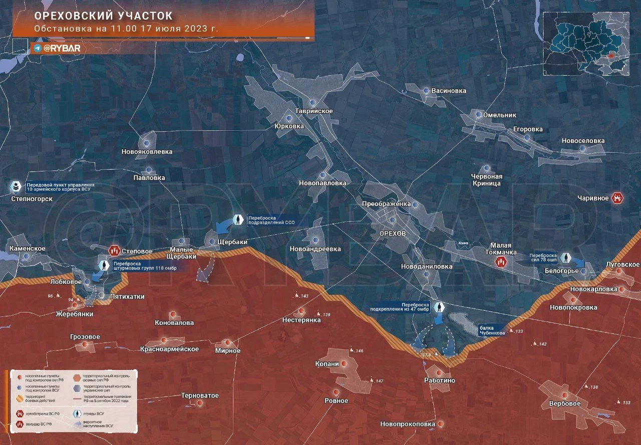 Карта боевых действий: Ореховский участок обстановка по состоянию на 11.00 17 июля 2023 года