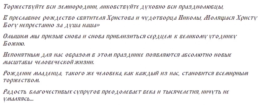 Святой Николаю Чудотворце, Угоднику Господний! При Жизни Своей Ты Не Отказывал Людям В Просьбах Их, Так И Ныне Помогаешь Всем Страждущим. Благослови Меня, Раба Господнего (Имя), На Исполнение Скорого Желания Сокровенного Моего. Проси Господа Нашего О Ниспослании Милости И Благодати Его. Пусть Не Оставит Он Просьбу Мою Желанную. Во Имя Господа Нашего. Аминь.