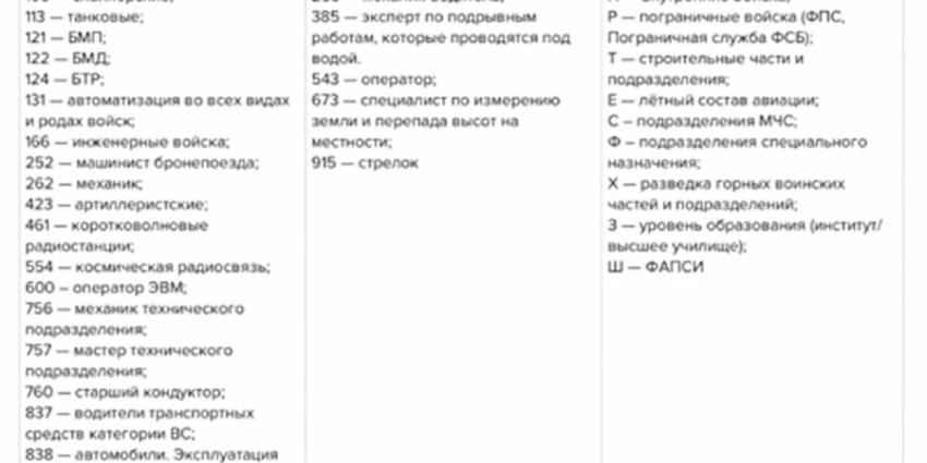 К примеру, ряд военкоматов заинтересован в следующих специальностях: 100, 106, 131, 166, 878, 879, 113, 554.
