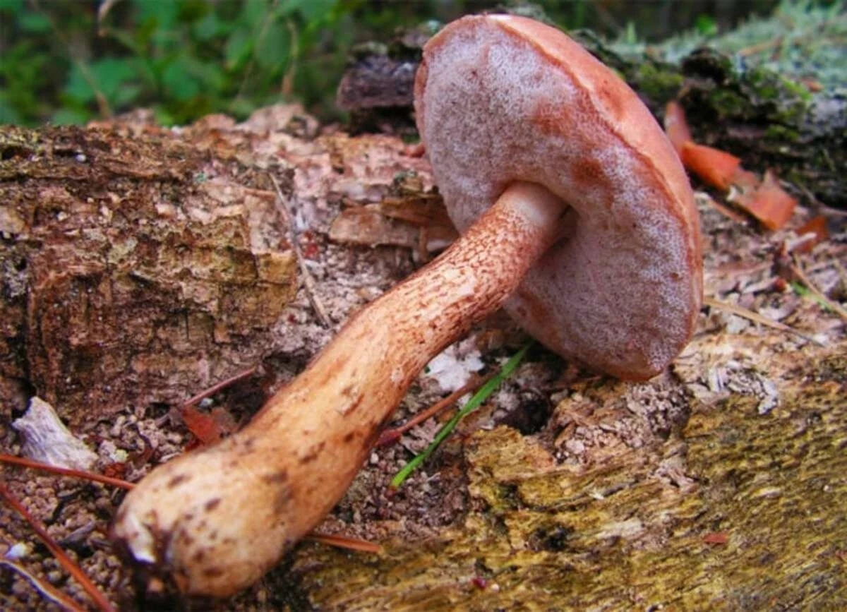 Сосновый белый гриб обладает коричневой ножкой и характерной каштановой шапочкой.