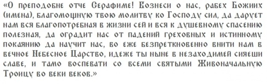 Верующие возносят свои молитвы святому Серафиму Саровскому, прославляя его за крепкое здоровье души и тела. Особенно важно это делать тем, кто страдает от болезней, так как считается, что в праздник Серафим Саровский услышит их молитвы и дарует исцеление.