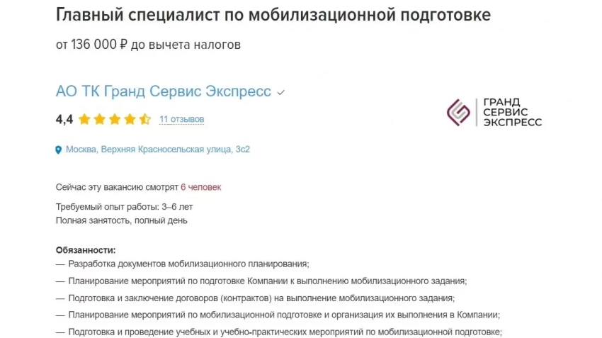 В других крупных городах ажиотаж не такой сильный, но похожие объявления тоже встречаются. В ходе мониторинга попадались вакансии специалистов по мобилизации из Владивостока, Красноярска, Москвы, Ростова-на-Дону, Новосибирска и других городов. Как правило, это крупные предприятия с большой численностью сотрудников.