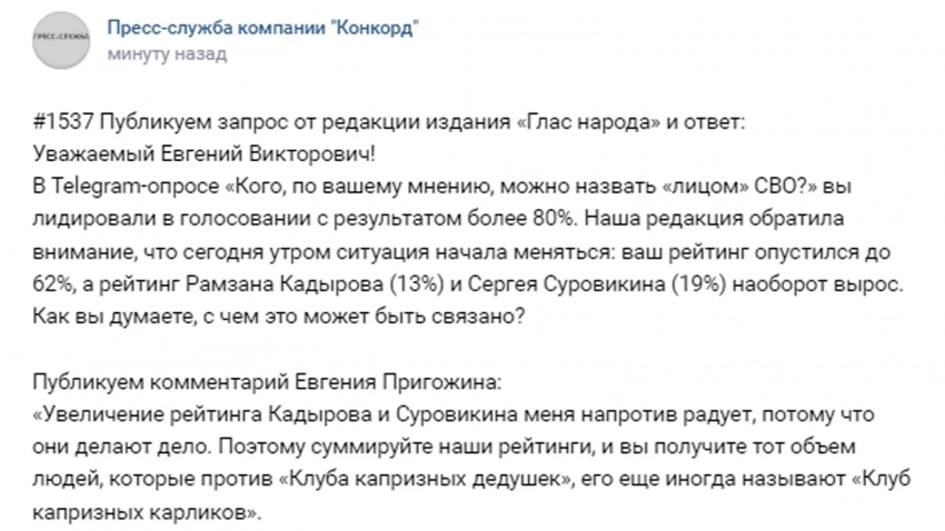 Основатель ЧВК «Вагнер» Евгений Пригожин прокомментировал изменения в рейтинге в рамках Telegram-опроса «Кого, по вашему мнению, можно назвать «лицом» СВО?».
