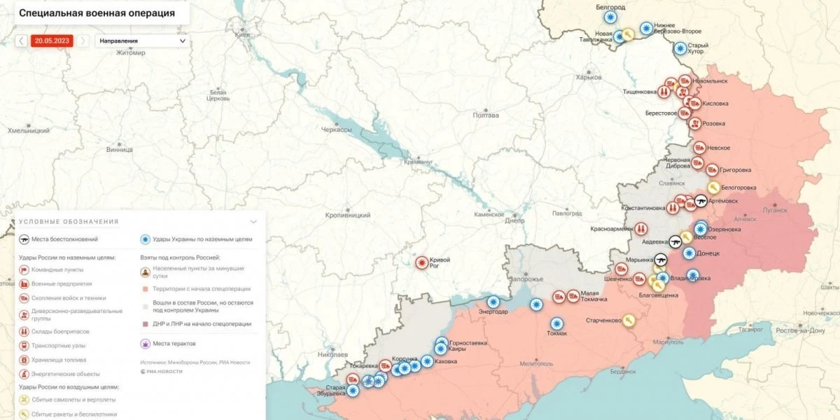 Спецоперация (СВО) России на Украине: ВС РФ меняют тактику ведения боя. Карта военных действий, сводки с фронта, Донбасс сегодня, 20 мая 2023