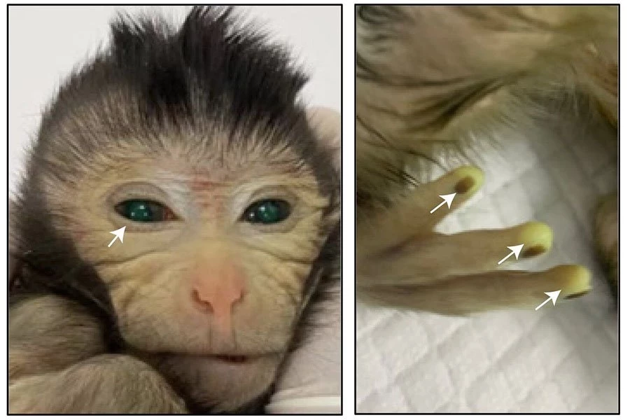 Некоторые из стволовых клеток затем были инъецированы в 4-5-дневные эмбрионы яванских макак и имплантированы самкам обезьян.