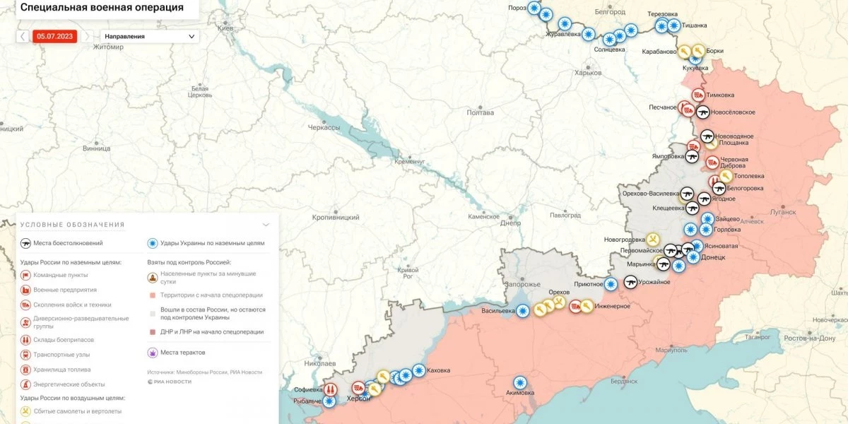 Последние новости о ходе военной спецоперации на Украине на сегодня, 5 июля 2023 года, новая карта боевых действий на Украине в материале «Интересной России».