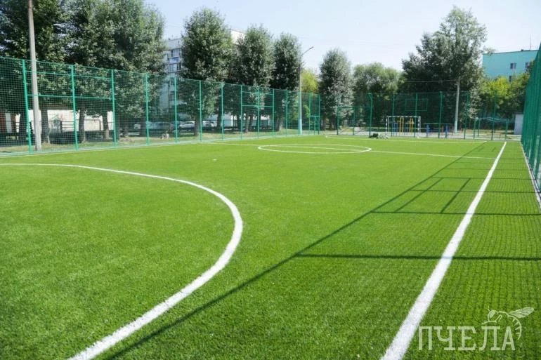 На уличном стадионе появился новый искусственный газон, футбольные ворота и ограждения