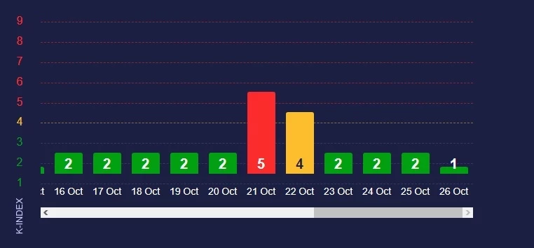 Пока что геомагнитная активность следующего месяца не выглядит интенсивной. Большую часть месяца она будет держаться на уровне 2 баллов. Скачок до 3 баллов ожидается только вечером 25 сентября – 26 сентября. При этом англоязычные источники прогнозируют пик солнечной активности до K-index 5 21 октября.