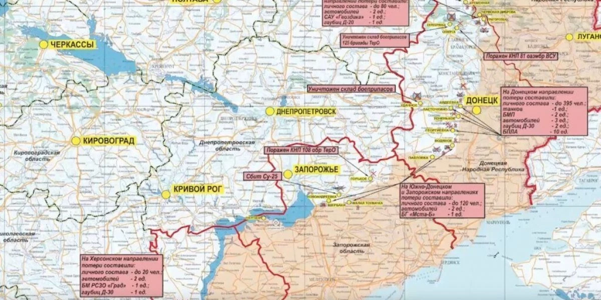 Южно-Донецком и Запорожском направлениях ударами авиации и огнем артиллерии группировки войск «Восток» нанесено поражение подразделениям ВСУ в районах населенных пунктов Водяное, Павловка Донецкой народной республики, Малая Токмачка и Щербаки Запорожской области. За сутки на данных направлениях уничтожено до 120-ти украинских военнослужащих, два автомобиля, а также гаубица «Мста-Б».