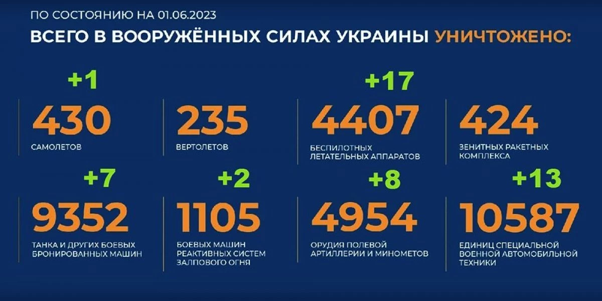 Потери Украины на сегодня 1.06.2023 Всего с начала проведения специальной военной операции уничтожено: 430 самолетов, 235 вертолетов, 4407 беспилотных летательных аппаратов, 424 зенитных ракетных комплекса, 9352 танка и других боевых бронированных машин, 1105 боевых машин реактивных систем залпового огня, 4954 орудия полевой артиллерии и минометов, а также 10587 единиц специальной военной автомобильной техники.
