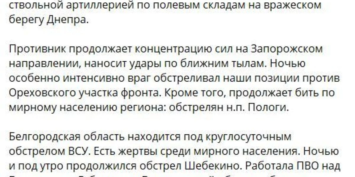 Вчера примерно в 04:00 (мск) после артобстрела противник в составе 30 боевиков и семи единиц бронетехники пытался атаковать в направлении Волчанска и международного автомобильного пункта пропуска Шебекино. Артиллерия Западного военного округа открыла огонь и уничтожила до десяти нападавших и боевую бронированную машину. Противник отошел в направлении Плетеневки.