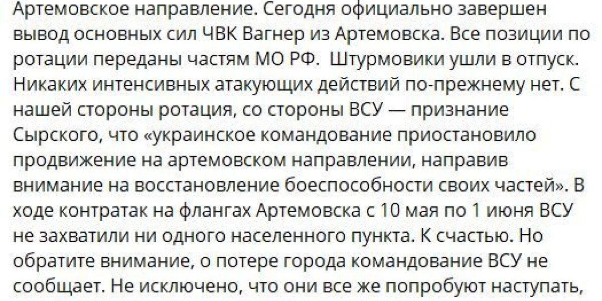 Артемовское направление: сегодня был завершен вывод подразделений ЧВК «Вагнер» из Артемовска. Все позиции были переданы ВС РФ. Тем временем командование ВСУ «приостановило продвижение» на флангах, якобы для восстановления боеспособности;