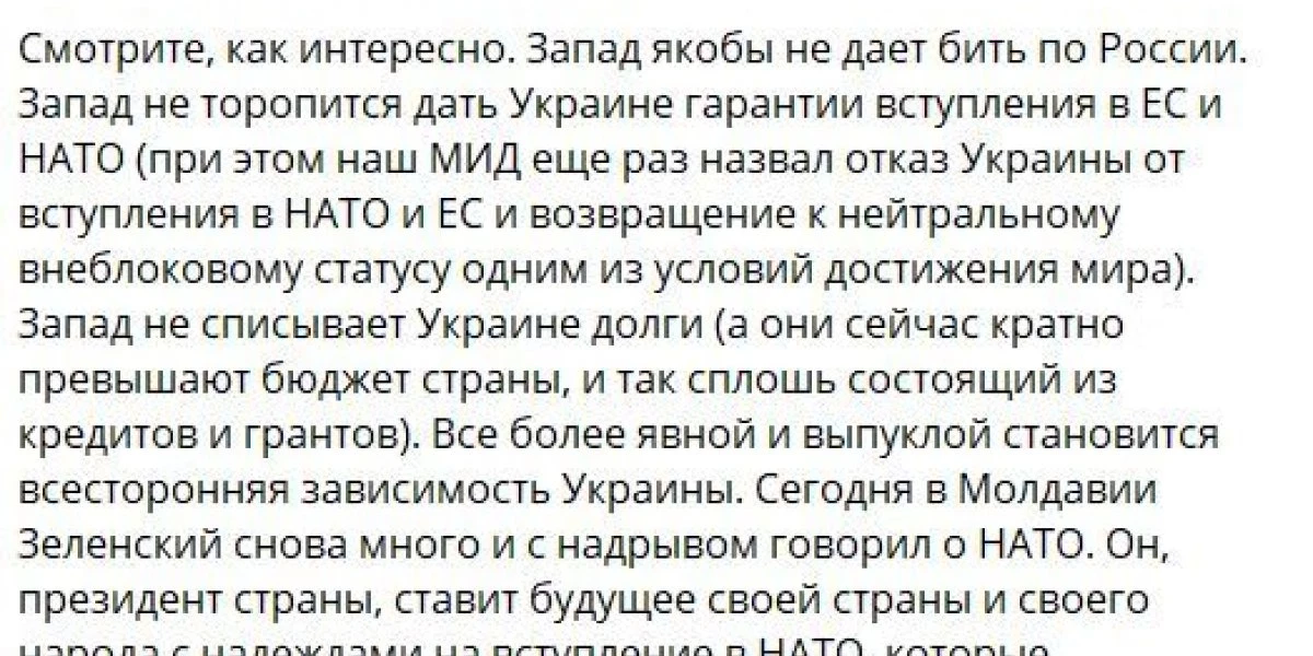 «Не только Германия, они там все не настроены на диалог. Самое главное, что на этот самый диалог не настроен Вашингтон, а эти все — подтанцовка США, которая исполняет волю хозяина. Их не устраивает диалог, так как ВСУ способны сопротивляться, так как поставки вооружений для украинской армии продолжаются. Вся эта история завязана на экономических интересах», — объяснил Александр Дудчак.