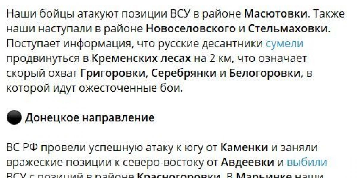 Сватово-Кременное направление: продолжаются ожесточенные бои в районе Масютовки и Двуречной. Также российская армия атаковали в районе Новоселовского. Российские бойцы продвигаются в Серебрянском лесу и ведут бои за Белогоровку;