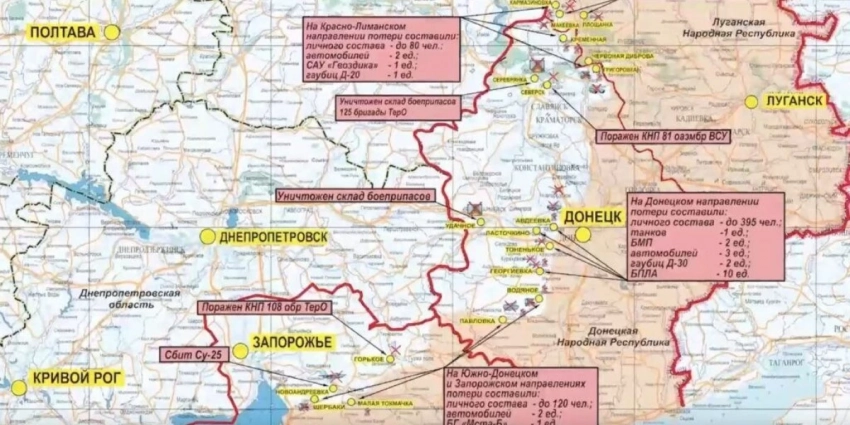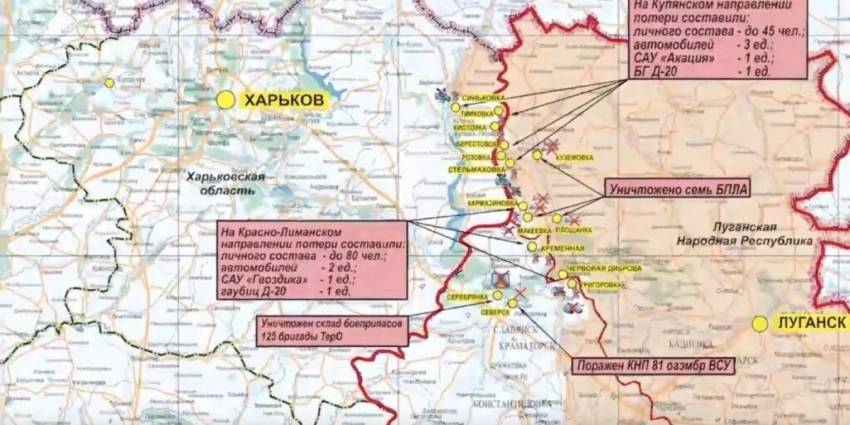 Российские войска нанесли удары по позициям украинской армии в районах Стельмаховки, Кармазиновки и Червоной Дибровы. У Розовки и Кременной пресечены действия диверсионно-разведывательных групп (ДРГ) противника.