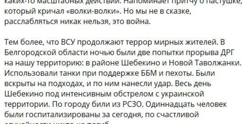 По последним данным, при обстрелах Шебекинского городского округа за сутки пострадали 12 человек, сообщил белгородский губернатор Вячеслав Гладков. Шебекино и окрестности обстреливали в течение всего утра из минометов и «Градов». По словам губернатора, ударам подверглась в том числе районная администрация. Также загорелось здание общежития.
