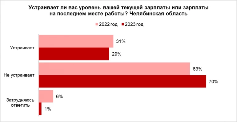 Около 70% жителей Челябинской области не удовлетворены текущим уровнем зарплаты. По сравнению с прошлым годом, доля таких ответов выросла на 7%. При этом больше всего тех, кого не устраивает текущий уровень заработка, среди врачей и фармацевтов (84%).