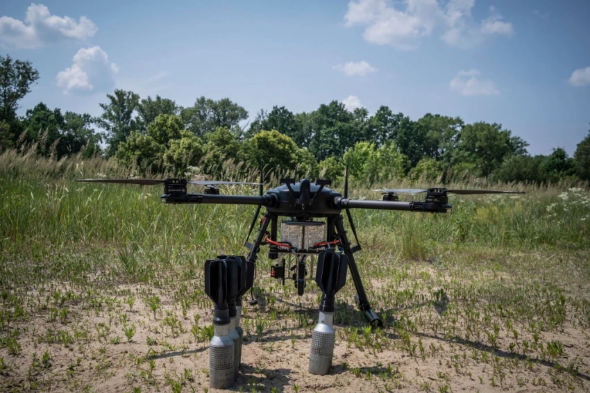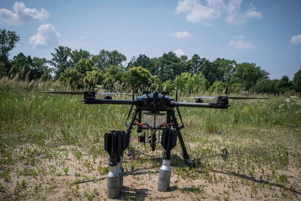 KYIV OBLAST, UKRAINE — 2023/06/20: First military-grade drone from Skylab, a Ukrainian civilian drone company. Skylab, a Ukrainian civilian drone company tested their first military-grade drone, as a step to support the war effort in Ukraine. The company claimed the drone, based on a Raspberry Pi computer, has an operational range of 7km with weapons loaded, along with a maximum payload of 6.8kg and 30 minutes of operational time. (Photo by Alex Chan Tsz Yuk/SOPA Images/LightRocket via Getty Images)