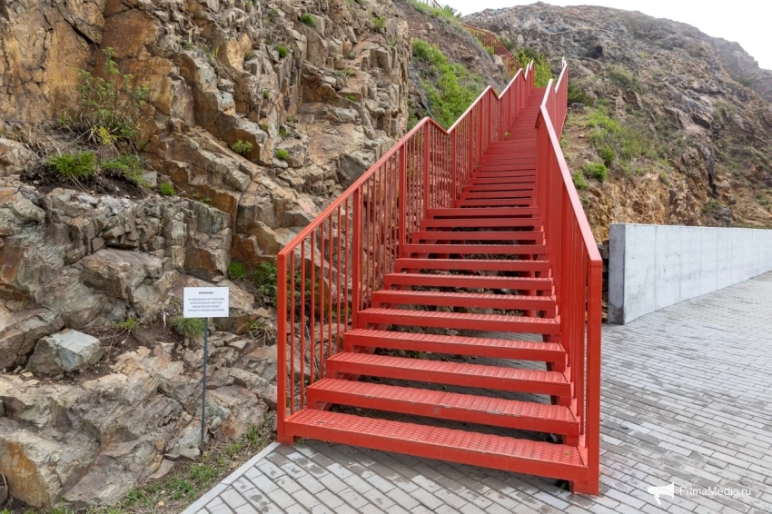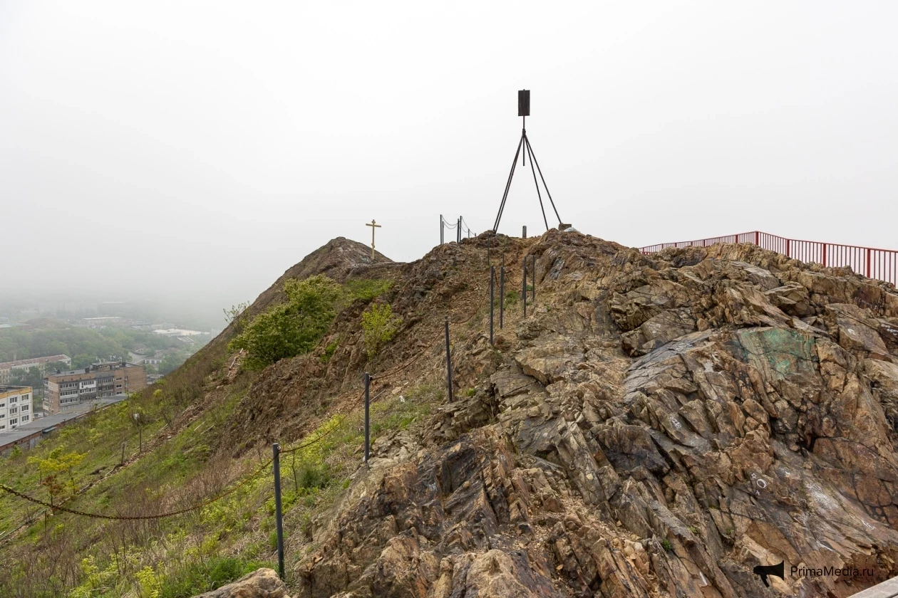 Далее путь не приносил трудностей вовсе. Комфортно проложенная серая линия асфальта сменилась красной металлической полосой лестницы, ведущей на популярную сопку Бурачка, откуда открывается прекрасный вид на туманный Владивосток и его мосты.