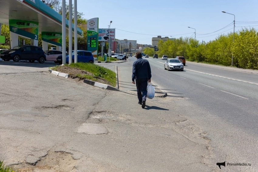 Пройдя через трамвайные пути, нужно вновь пройти по стёршейся разметке перехода, а после по “бездорожью” и паллетам возле аллерго-респираторного центра на Спортивной, 10 добраться до максимально узкого тротуара между ограждением и дорогой. В этой “пешеходной зоне” если гуляешь с ребёнком в коляске, то придётся идти по дороге навстречу машинам. Но, когда закончится ограждение, тротуарная зона снова появится и дальше, по дороге, станет облагороженной зеленью.