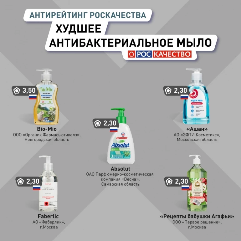 Сначала к хорошим новостям — всё исследованное мыло безопасно. А вот дальше начались нюансы. Тест пяти товаров не подтвердил заявленные антибактериальные свойства: Bio-Mio, ABSOLUT, «Ашан», Faberlic, «Рецепты бабушки Агафьи». Эти продукты оказались бессильны против всех видов бактерий, на которые проводилось тестирование. Остальные 15 эффективны как минимум против одного штамма.