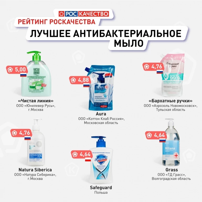 Мыло эксперты проверили по 25 критериям качества и безопасности. 17 товаров были произведены в России, ещё по одному — в Турции, Польше и Франции.