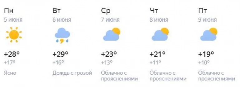 По данным местного Гидрометцентра, в воскресенье, 4 июня, столбики уличных термометров поднимутся до +28…+33, местами до +36, при этом ночи ожидаются тёплыми — до +14…+19 градусов. Также днём возможны кратковременные дожди, грозы и даже град. Ветер северной четверти будет дуть со скоростью 3–8 метров в секунду, днём — порывы до 14 метров в секунду.