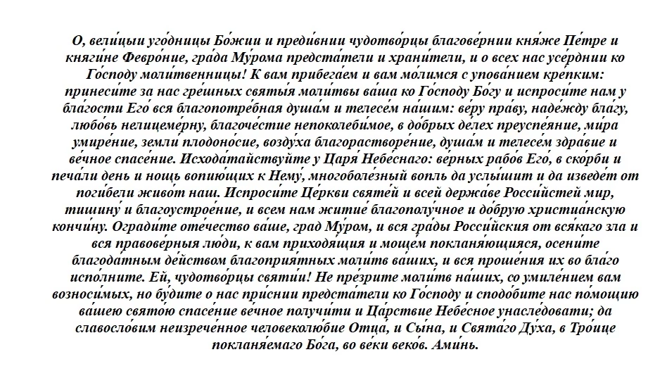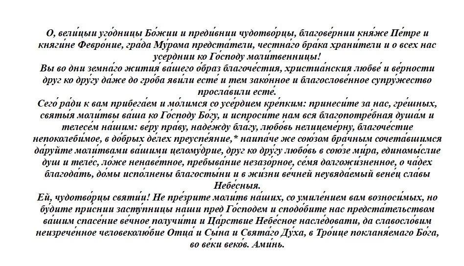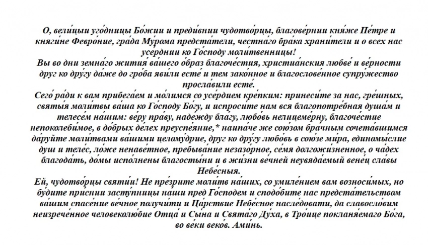 Главный акцент делается на князя и княгиню Муромских Петра и Февронию. Им читают сразу несколько молитв. В оригинале они звучат так: