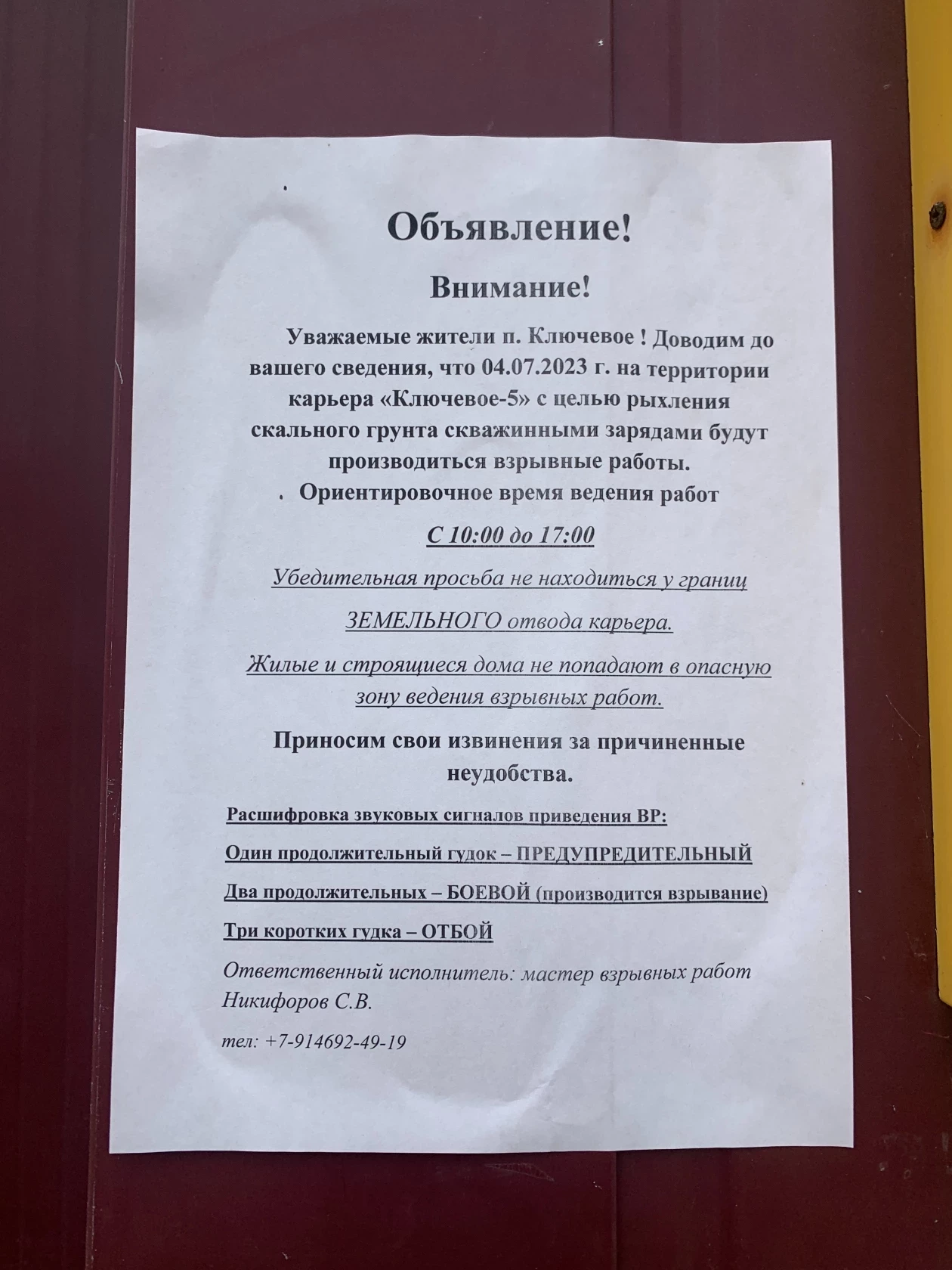 Предупреждение о предстоящий взрывных работах от компании “Грань” на здании магазина в центре поселка Ключевой. Фото: ИА PrimaMedia