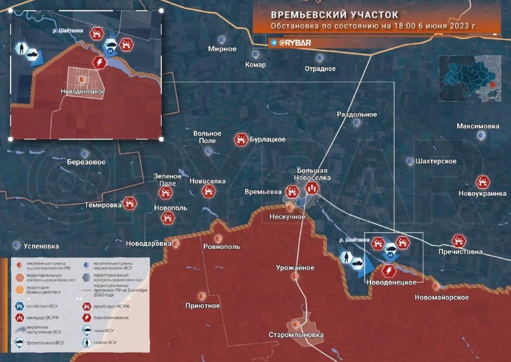 Карта боевых действий: Времьевский выступ обстановка по состоянию на 20.00 6 июня 2023 года