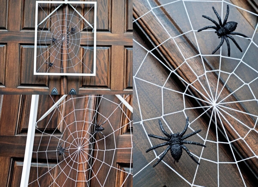 Декоративная паутина — это одно из немногих украшений, которое легко и быстро можно сделать своими руками. Вам понадобятся всего лишь 2-3 мотка белых ниток и канцелярские иголки-гвозди. Выберите углы в помещении, которые сразу бросаются в глаза, закрепите гвозди на стенах и намотайте на них нитки. По желанию добавьте декоративных пауков, вырезанных из бумаги. Этот декор создает впечатление заброшенности и мистики.