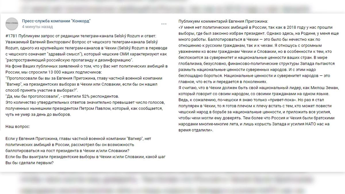 Комментируя запрос редакции чешского Telegram-канала Selský Rozum Пригожин отметил, что финансово-политические структуры западных стран пытаются размыть национальные ценности суверенных народов Чехии и Словакии. Он подчеркнул, что с таким положением дел необходимо беспощадно бороться.