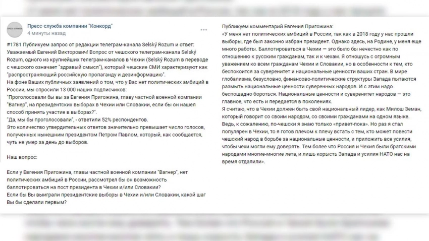 Основатель ЧВК «Вагнер» Евгений Пригожин сообщил, что готов поддержать граждан Чехии и Словакии, которые отстаивают суверенитет и национальные ценности своих стран.