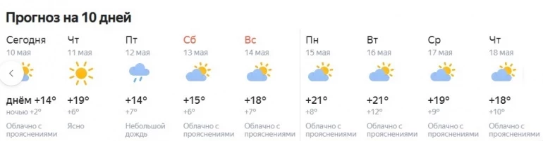В Челябинске минувшей ночью заморозки до -1 фиксировали только на почве. Днём будет от +13 до +15 градусов, возможен небольшой дождь. По данным долгосрочного прогноза от сервиса «Яндекс.Погода», ближайшая ночь окажется сравнительно тёплой — столбики уличных термометров опустятся до +6. А день выдастся солнечный и тёплый, до +19 градусов.