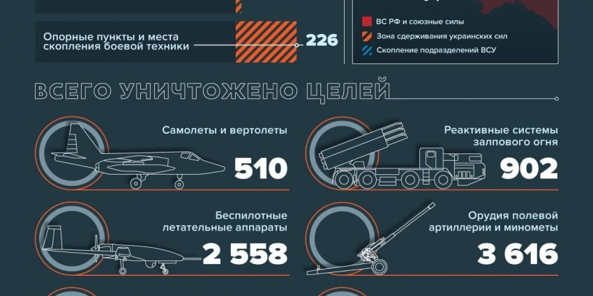 В результате боев за сутки ликвидированы или ранены более 125 солдат Вооруженных сил Украины (ВСУ), уничтожены 17 единиц различной военной техники. Также поражены два пункта управления, 63 артиллерийских подразделения, 152 района сосредоточения войск противника.