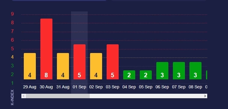 На потенциальные возмущения, например, указывает инфографика meteoagent.com. На 2 сентября прогнозируется «желтая» буря мощностью K-index 4, отмечают журналисты pronedra.ru. Это будет спад между пиками в K-index 5.