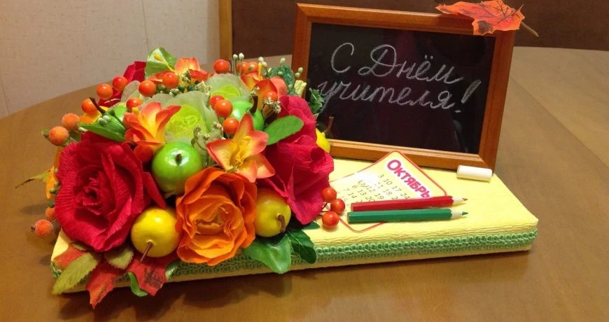 Помимо традиционных букетов цветов, на День учителя предлагаются разнообразные недорогие, но при этом запоминающиеся подарки.