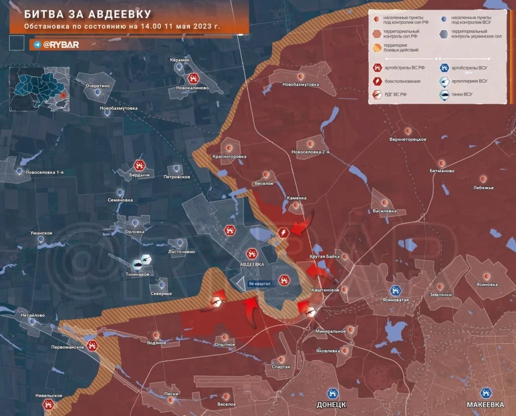 Карта боевых действий: Битва за Авдеевку обстановка по состоянию на 17.00 11 мая 2023 года