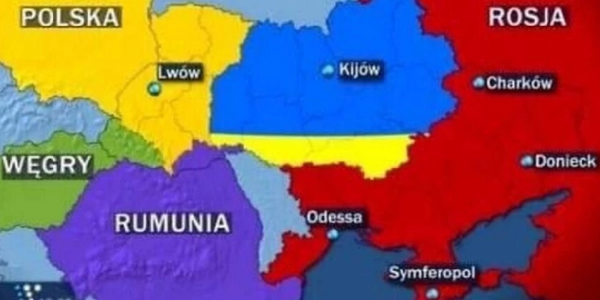 С первым рисунком все понятно — украинский президент мечтает о «перемоге», которая уже никогда не осуществится. Ну да, что бы Донбасс и Крым вернулись в состав Украины — это не просто фантастика, а откровенный бред, который даже и скучно комментировать. А вот на второй карте произошли огромные изменения в сравнении с нынешней ситуацией — хотя бы потому, что Украина хоть и осталась, но лишь в пределах Киевской области. А все остальные ее регионы уже не принадлежат ей — они поделены между четверкой ее соседей — Россией, Польшей, Венгрией и Румынией. Причем, достаточно интересным образом.