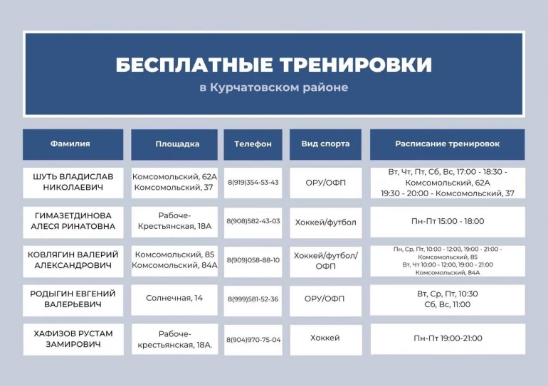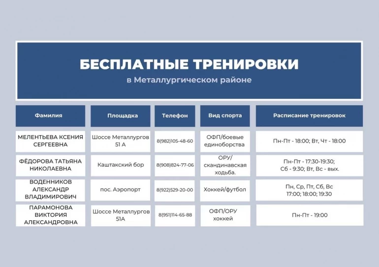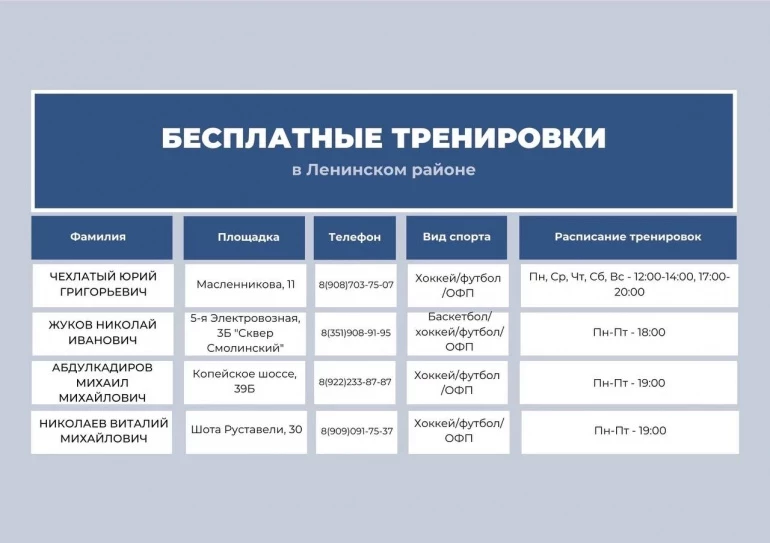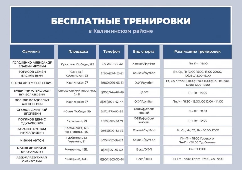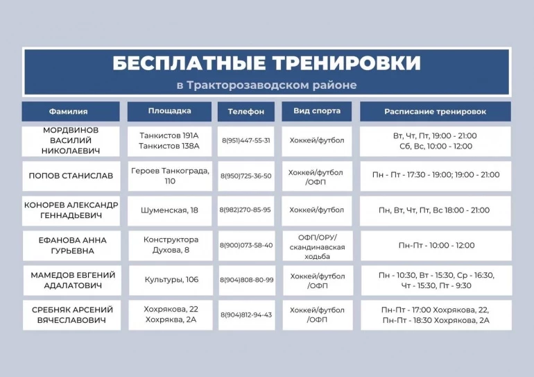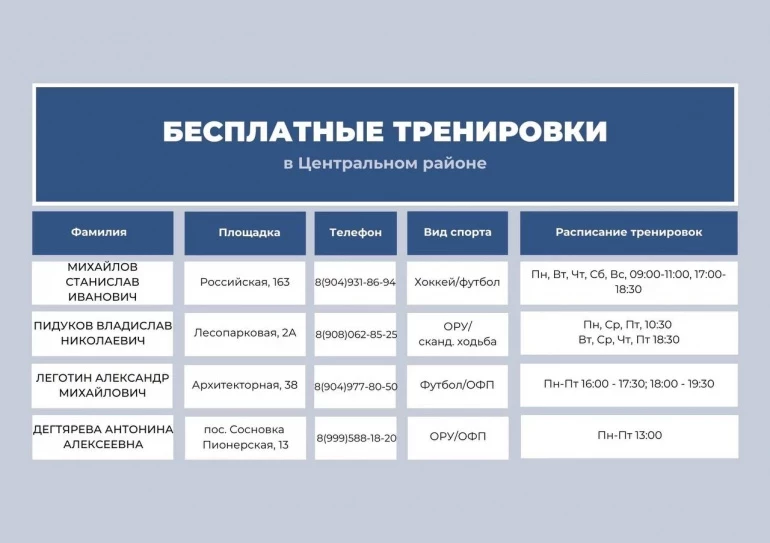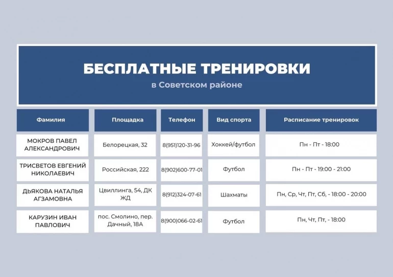 С расписанием тренировок и адресами площадок можно ознакомиться в карточках.
