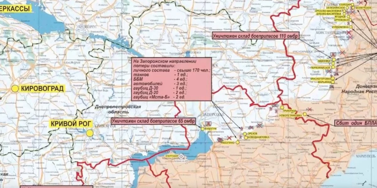 Общие потери противника за сутки на данных направлениях составили свыше 170-ти украинских военнослужащих, один танк, четыре боевые бронированные машины, три автомобиля, две гаубицы «Мста-Б», две гаубицы Д-20, а также одна Д-30.